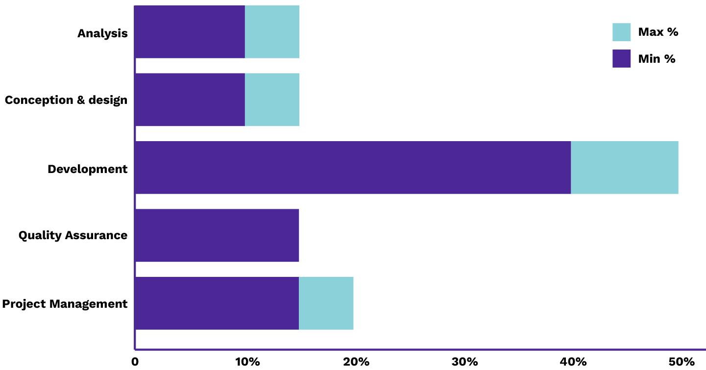 Typically, a custom software project is divided into five main phases, with each receiving a percentage of the total budget.